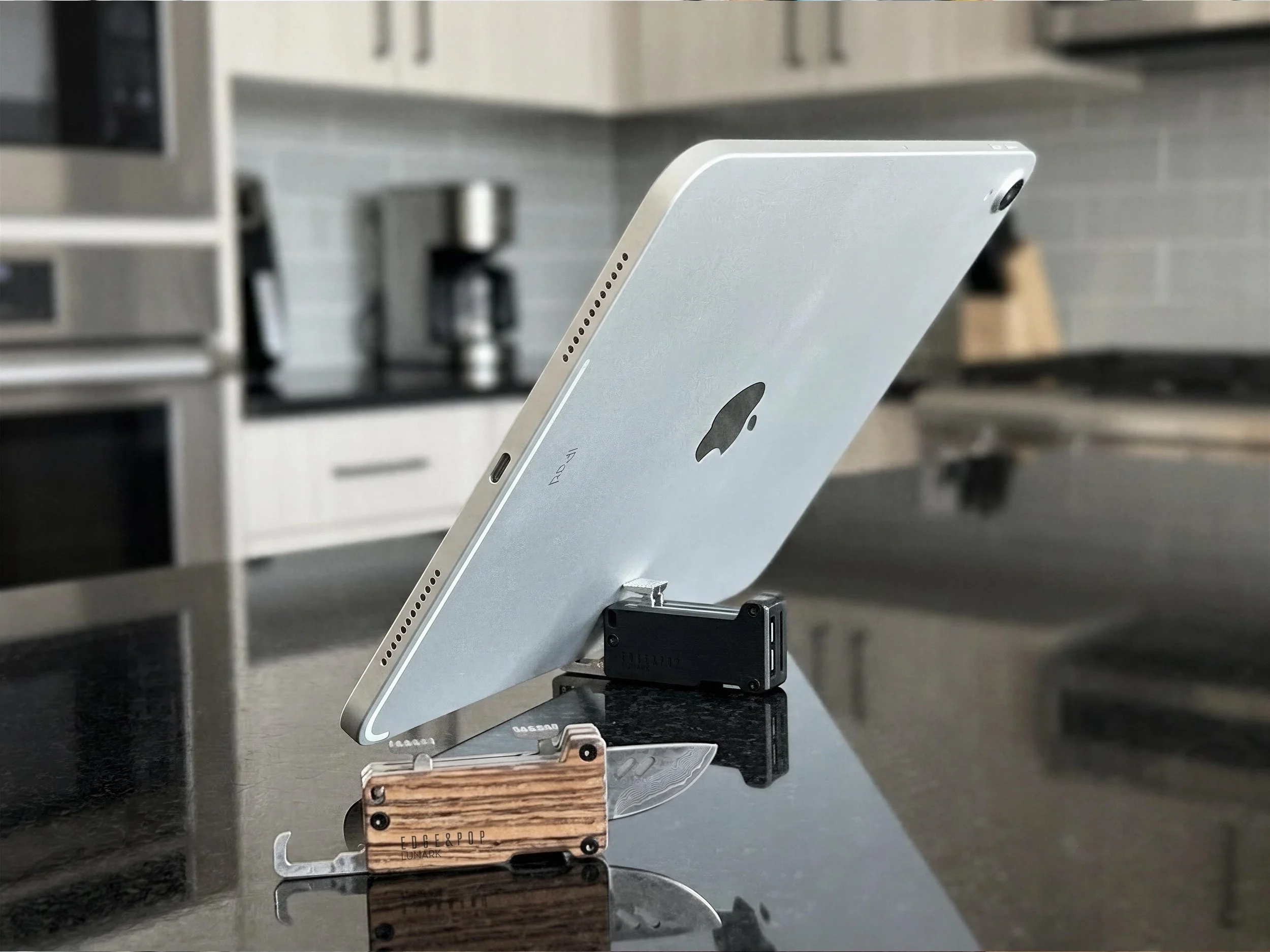 Edge & Pop Dual is a compact Damascus slide tool with a precision cutting edge, and a built-in phone stand when closed for portrait or landscape viewing, even tablets in landscape.